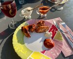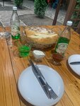 Красивое расположение -Кафе на берегу озера.Открытая площадка со столиками и беседки с гибкими шторами -на случай непогоды. Меню местной кухни , заказывали хинкали.Вкусно, но тесто немного Толстова то.Хотели выпить белого вина ,но его не оказалось в наличии ( середина будничного дня) заказали пиво ,вот незадача , только по 0,5 , и в пластиковых стаканах( это уж через край, стекла нет?)