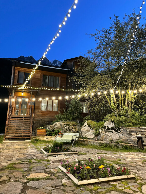 Мне очень понравилось месторасположение отеля: национальный парк Алания, пешие и автомобильные экскурсии по тропам. Очень вкусная кухня в кафе: местные продукты, отменная баранина, очень понравилась томленая. Цены в кафе стандартные, семья из пяти человек со средним чеком 5500 руб. Номера разные, мы жили в двухэтажном. Белье белоснежное, полотенца, халаты, тапки, мыльно-рыльное. Отопление электрическое, посоветую заранее попросить его включить, и бойлер тоже, так как долго нагревается. Персонал отзывчивый, парень официант, Арсен, помог решить возникшую проблему с машиной. За что ему огромная от нас благодарность! Территория в процессе облагораживания, но это ничего страшного, вокруг такие виды, что голова только вверх и смотрит: водопады, ледники и красивая горная река! Однозначно советую! Для малышей предусмотрены кроватки. Зимой кипяток наливают в кафе, чтобы избежать лишней нагрузки от чайников в номерах. Так что берите термос с собой. И да, на территории есть дизель-генератор на всякий.