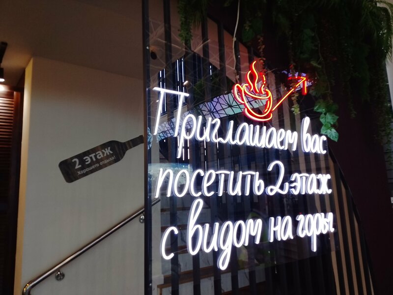 Уютное и эстетически привлекательное место. Вкусная еда, красивая подача. На 2 этаже просторный зал с красивым видом на горы, там тоже есть статуя 😆 Можно вызвать официанта с электронного меню на столе, что очень удобно!!!