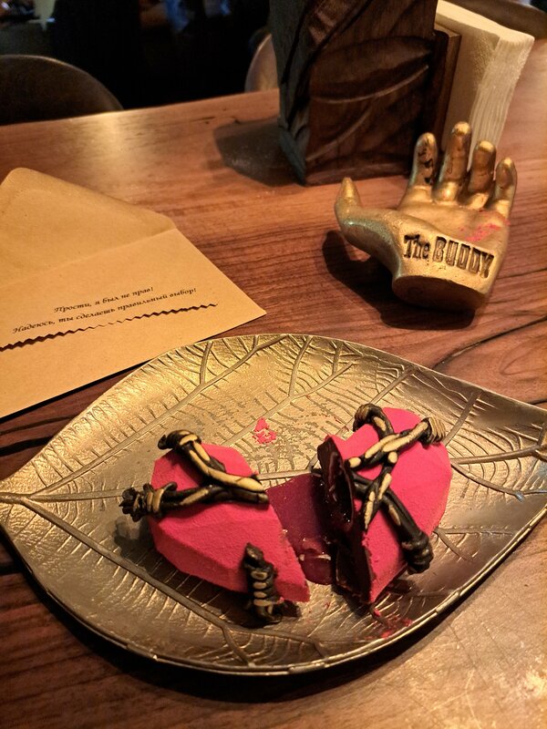 Интерьер , обслуживание и подача красивые. Видимо поэтому и популярный ресторан. Но еда я сказала бы не очень, возможно я выбрала не те блюда. Первое была уха с лососем и камбалой, принесли все красиво, рассказали предисловие, дали наушники послушать типа песни у костра. По факту в ухе рыбы практически не нашла ,2 волосинки лосося и плавничок камбалы. Маленький кусочек картофеля. ЗАТО ! моркови не пожалели морковный суп)). Короче гадость и еще усилители вкуса прям очень чувствовались. Поковырялась , доедать не стала. Заказала знаменитый десерт "Сердце бывшего " , подача интересная развлеклась. На мой вкус очень, очень сладко, но это на любителя. Итог чек на одного первое, чай + десерт , бокал вина 125 гр. - 3000 руб. Посмотрела так же , что заказывали посетители за соседними столами, ну как и писала выше подача интересная, есть особо нечего, на вкус не скажу. Заведение модное, места надо заказывать. Не впечатлило))