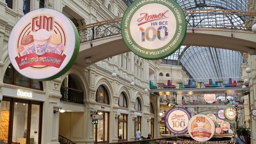 Историческое здание в самом центре Москвы. Постоянно меняется оформление линий в соответствии с праздниками или какими-то датами. Цены высокие, в основном зайти туда посмотреть интерьеры. Можно пообедать в столовой на 3 этаже. Это, пожалуй, единственное более-менее бюдждетное место. Даже знаменитое мороженое уже совсем не того вкуса и по космической цене.