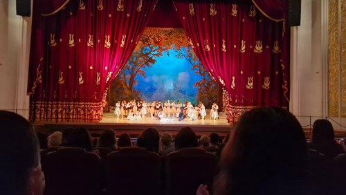 Сам театр очень красивый и снаружи, и внутри. В сквере большой фонтан, Были на спектакле "Жизель". Хоть не один раз смотрели в московских театрах и вроде бы хорошо знаем этот балет ,были в восторге от труппы, декораций, костюмов. Конечно, есть отличие, причем в лучшую сторону. Особенно запомнился выход на сцену животных - борзых собак и лошади. Солисты заслуживают самой высокой оценки. Также порадовала синхронность кордебалета.