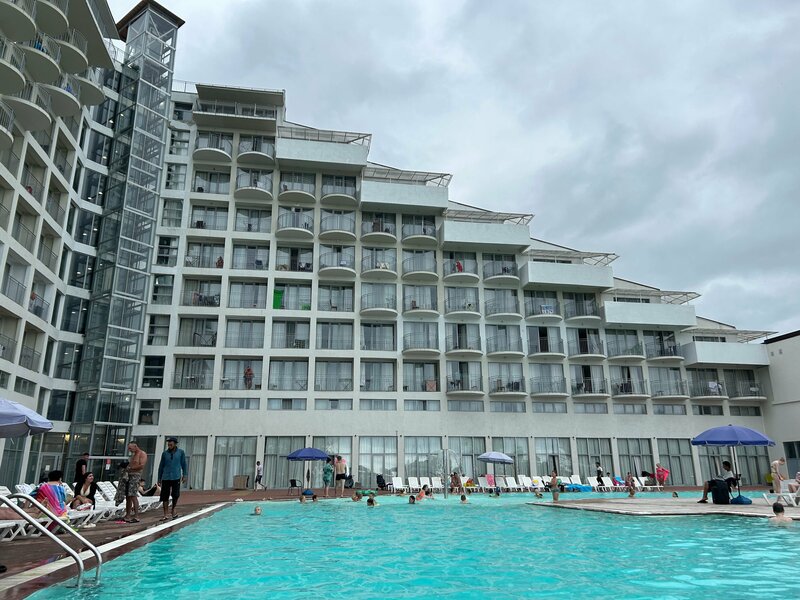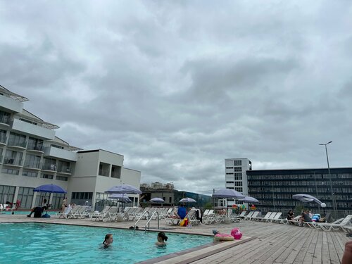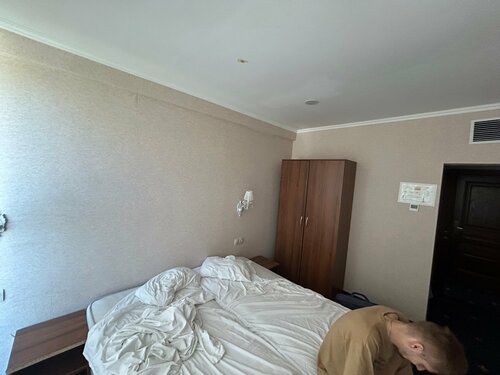 Отдыхали 01.07.2025-07.07.2025. В целом, нормально, если знать, что это гостиница, 3 звезды, и прочитать заранее здесь отзывы) то есть мы получили то, чего и ожидали. Номер ужасный. На полу пятна, на стульях тоже, всё держится из последних сил. В ванной плесень. Полотенец не было ни одного!!! А свои я, как назло, забыла положить 🤦‍♀️ хотя записала, прочитав здесь про это отзывы. Наконец, на 2 день нам их выдали! Кровать состоит из двух односпальных и двух матрасов. Для нас это была проблема, так как с нами спал ребёнок маленький, по сути дочь спала на расщелине. Ни разу не убрались за неделю, хотя мы оставляли заявки. А ребёнок ещё ходить не умел, только ползал. Было неприятно, с кровати вообще получатся не отпускали дочку. Отель не новый! как это позиционируют в Успех тур. Там есть новый корпус, там и бассейн покруче, с пальмами, и детская площадка на их территории. Возможно речь про него. Бассейн наш так себе, было неприятно в нём купаться, брезгливо было ходить по дну, покрытие дна резиновое, как на стадионе, не представляю, как они его могут хорошо чистить)))) да и, судя по всему, не чистят, вода мутная, лежаки ужасно чёрные. Еда в столовой сойдёт. Старались готовить разнообразно. Гарниров 3-4, столько же видов мяса. Хлеб, овощи, фрукты. Мне нравились завтраки. И жареная рыбка вкусная была. Больше всего расстроили сами туристы :( Вели себя в столовой как свиньи и как с голодного края. Набирали себе фруктов и овощей килограммами. Зачем? Возьмите столько, сколько съедите. С собой всё равно выносить еду нельзя. Сколько мы видели, что потом всё оставалось на столах, жалко было, что кому-то не хватало, а у кого-то харя треснула. Да и мы на базаре рядом брали фрукты, нам хватало. Теперь главное! 4ую ночь я провела в обнимку с унитазом. Я думала, там и помру 🤣 думала, это никогда не закончится. Но благо, к 6 утра я смогла уснуть)))) на следующий день отпуск был приостановлен, лежали весь день в номере, у меня температура была 39 🥴 и проблема была ещё в том, что я кормлю ребёнка грудью и мне запрещены почти все лекарства. НО! Мы же подготовились 🤣 собрали аптечку на этот случай. На следующий день уже возобновили экскурсии. Но осадочек остался. Не знаю, что это было, еда, бассейн, или что… но в бассейне и море я с головой не ныряла. БЛАГО С РЕБЁНКОМ И МУЖЕМ ВСЁ БЫЛО ХОРОШО и их это обошло. На территории есть вкусная кофейня, мы там брали перекусы для экскурсий. По поводу них: мы брали две от Библио Глобус, что на первом этаже предлагают, Сокровище Гагры (4 часа) и На озеро Рицца (9 часов). Очень понравились. Всем советуем! Хоть мы и были с ребёнком годовалым, всё прошло хорошо. Море вообще не рядом. До него нужно идти окопными путями, плюс сам пляж ужасный, он на возвышенности, к берегу нужно спуститься по лестнице. Находится на отшибе, рядом с какими-то завалами. Инфраструктура рядом хорошая. Ходили один вечер до колеса обозрения. Короче, отелю я ставлю 3 звезды, но самим Гаграм 5, поэтому 4. Фотки прикрепила чисто про отель, сами Гагры невероятные 😍😍😍