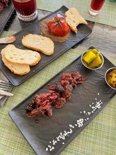 Случайно оказались в ресторане. Хотели отведать манты из медвежатины, не оказалось в наличии. Взяли рваное мясо, паштет, грузди, баклажаны, настойки, кофе и десерты . Десерт шарлотка и настойки - не понравился. Настойки отдают спиртом, десерт не вкусный, сухой, плотный.