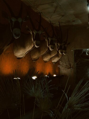 Ресторан имеет 3 зала, в первом можно забронировать столик в любой день, во втором бронировании открыто только в будни, а третий вип-зал, для определенных гостей. Меню небольшое, есть горячее, закуски и большая барная карта. Для всех гостей проводят экскурсию по двум залам, где представлены экспонаты чучел африканских, а также арктических животных. Средний чек 3000 тыс. руб.