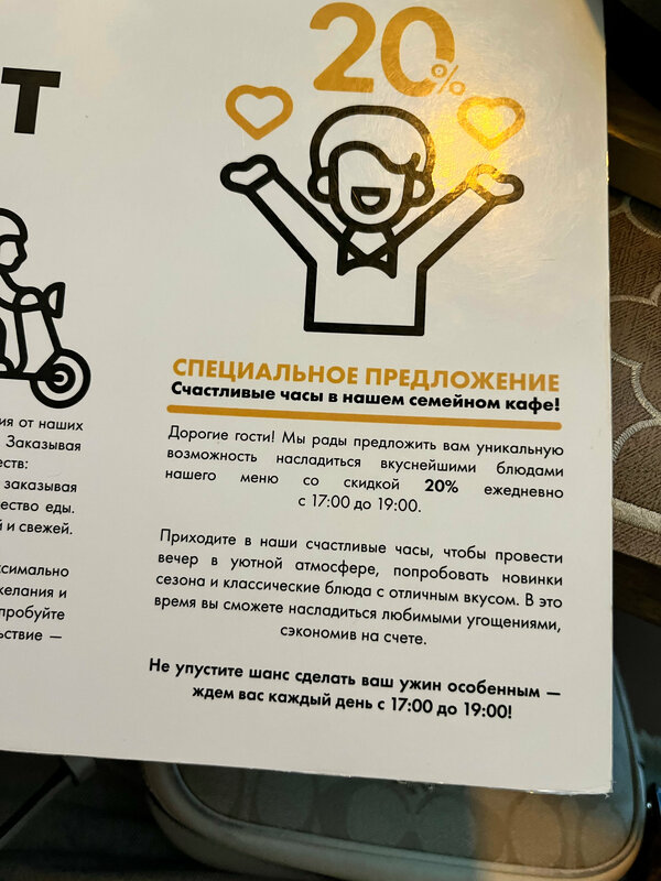 Пришли сюда в воскресенье 02.08 около 17:30. Заказали пасту карбонару, два лимонада и сковородку с курицей. Оплачивать заказ нужно сразу, мы быстро оплатили и ждали когда нам принесут еду. Когда нам принесли еду, мы вспомнили о том, что каждый день с 17:00 до 19:00 здесь проходят счастливые часы и на каждое блюдо здесь действует скидка 20%. Наш заказ вышел в 1710 рублей, посчитали стоимость без скидки. Скидка составила бы 342 рубля. Мы подозвали официантку сказать об этом, на что она ответила «ой, нам надо об этом напоминать. В следующий раз когда придете, напомните». Спрашивается, зачем тогда такая акция? Официанта не извинилась, не предложила вернуть деньги или взамен какой-нибудь лимонад за неудобство и чтобы опять же не производить возврат на эту сумму. В доказательство прикрепляю фото акции, которая у них написана в меню. Так же акция указана на Яндекс картах.