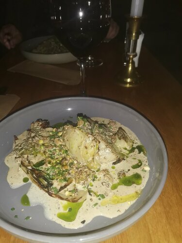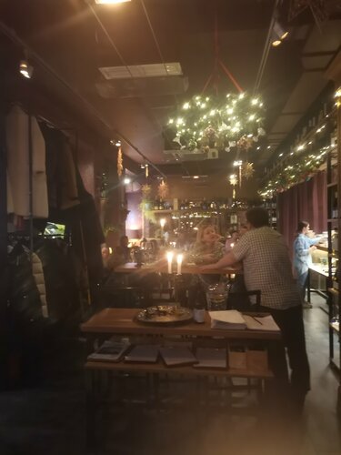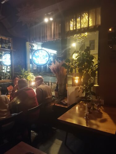 27.12.25 шли из театра. Спектакль очень рано закончился, и мы решили заглянуть в это заведение поужинать. Вошли сюда мы ровно в 21.00. Место, действительно, замечательное, эдакий полумрак. Великолепно годится, как для свидания, так и для посиделок с друзьями-подругами. Поскольку наедаться на ночь вредно, мы решили взять по стейку из капусты со сморчками в сливочном соусе и по бокалу вина "Карминер резерв". Ну, люблю я чилийские вина! Капуста оказалась полусырой, и нам эти блюда вычеркнули вообще из счета. А вместо этого принесли комплимент от шефа в виде финика с горгонзолой и бонусом налили ещё по 150 мл этого же вина. Чудеса! Давно не видела такого отличного сервиса! Мы остались очень-очень довольны работой официанта Анастасии, замечательная девушка: коммуникабельная, компетентная и жизнерадостная! Большой привет ей от девочек-пенсионерок!!! Побольше бы всем ресторанам такого персонала!!! Отлично и весело посидели в этом заведении!!! Рекомендую к посещению. А работают они с 12.00 до самой полуночи. И очень удобная локация, 5 мин. ходьбы от метро "Сухаревская".