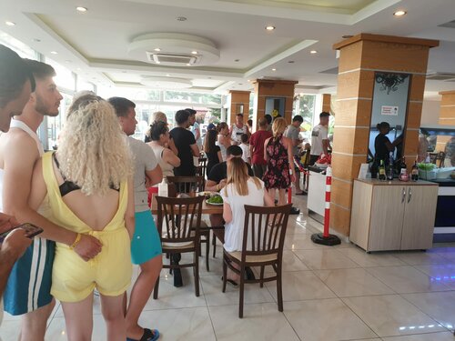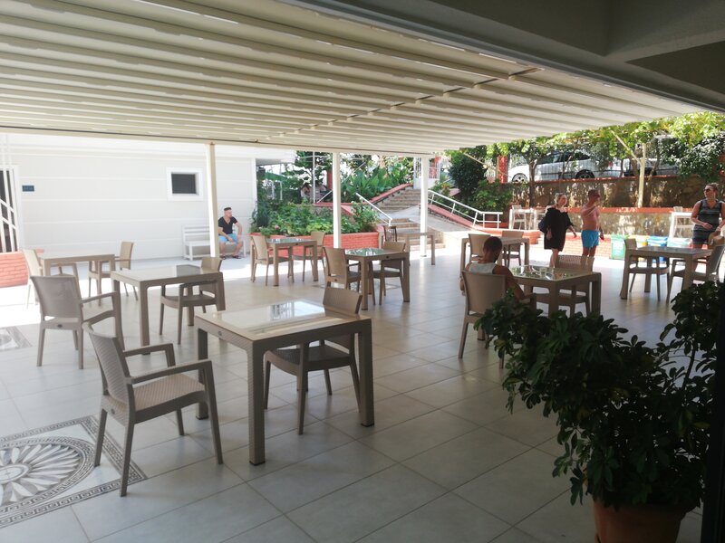 Отдыхали в этом отеле в июле 2021 г. Отель очень испортился. На завтрак 2 варёных яйца, картошка фри, пропаренные овощи и салатный стол. Нет яичницы, омлетов, йогуртов, блинчиков, сладости не дают вообще, из фруктов только арбузы, раз в неделю яблоки и сливы, мясо не дают, только котлеты и нагитсы, редко курицу в зелёном соусе. Накладывают мало, еду жёстко экономят. Доступа к питьевой воде нет, воду в номер не разносят, наливают только в баре в стаканы. С детьми, у кого аллергия и кого трудно накормить, тут останетесь голодными. На персонале экономят, сама хозяйка с перебинтованным пальцем без перчаток и фартук раздают еду на раздаче. Убирают нормально, номера хорошие. Бассейн в зоне бара и обедов. С одной стороны хорошо у кого дети приглядывать, с другой на тебя все глазеют. Море через дорогу, лежаки платные. Интернет только на ресепшен. Рядом магазин Мигрос. Хозяйка отеля ходит с собакой, она на всех лает, если подойдёшь поближе. Если вам только переночевать, то подойдёт, а с детьми тут взвоете.