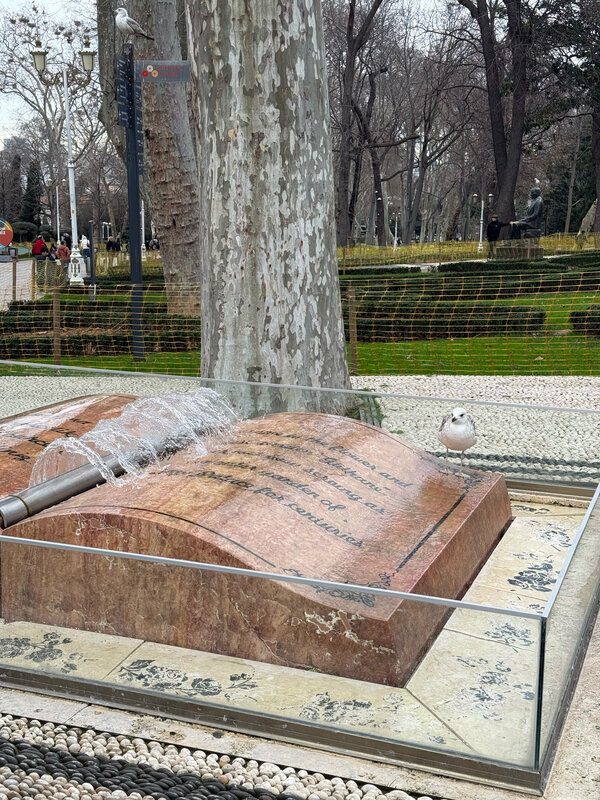 Интересная задумка! Сразу у главного входа посетителей парка встречает Фонтан-книга. Мраморный фонтан сделан в форме открытой книги, движении струи воды изображает перелистывание страницы. Надпись в книге звучит, как приветствие: “добро пожаловать в Гюльхане, дом цветущих роз при дворце Топкапы”.