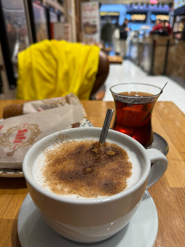 Очень сочный и вкусный кюнефе за 400 лир, свернув с пешеходной улицы Истикляль (февраль 2026). Вкусный кофе, приветливый хозяин. Столики расположены на улице, зимой некомфортно сидеть, холодно. Напитки и еда быстро остыли