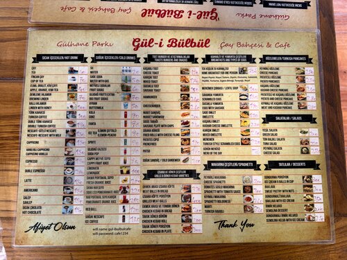 Цены средние, еда вкусная, туалета нет и руки помыть негде (или идти в платный туалет в парке, где оплата по истанбулкарт) В будни в феврале было малолюдно в кафе. Подача быстрая. Есть зал для некурящих и веранда для курящих