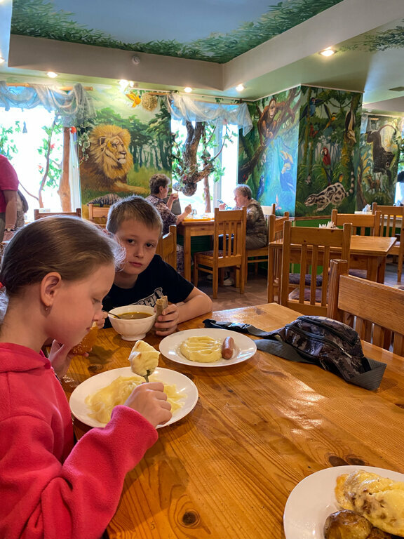 Красочная столовая, шедевр просто. Расписные стены, скульптуры животных очень красиво. По еде все тоже вкусно и доступно по цене на семью