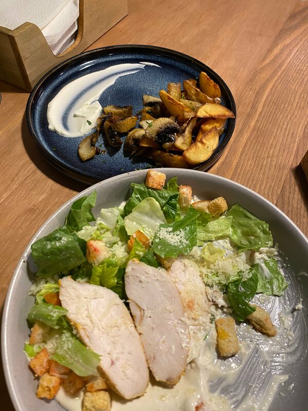 Любимый салат цезарь - понравилось, что соусом пропитали не весь салат и можно самой дозировать количество соуса. Картошка вкусная, но хотелось бы более насыщенного соуса, а не просто безвкусную сметанку. Приятная атмосфера, вежливые официанты, стильный интерьер!!!