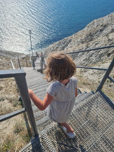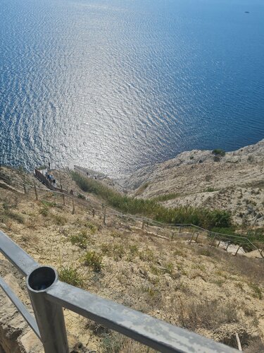 Красивое, колоритное место! Лестница длинная, довольно крутая, по дороге есть площадки со скамейками для отдыха. Лучше надеть удобную обувь (кроссовки например), так как есть вероятность потерять шлепки по дороге. Обязательно нужно взять побольше воды. После спуска вы оказываетесь на малолюдном галечном пляже с очень красивыми скалами и видом. Есть прокат сапов за 500 рублей. В воду зайти довольно проблематично, так как камни очень скользкие. Подниматься уже гораздо сложнее, но это того стоит😁