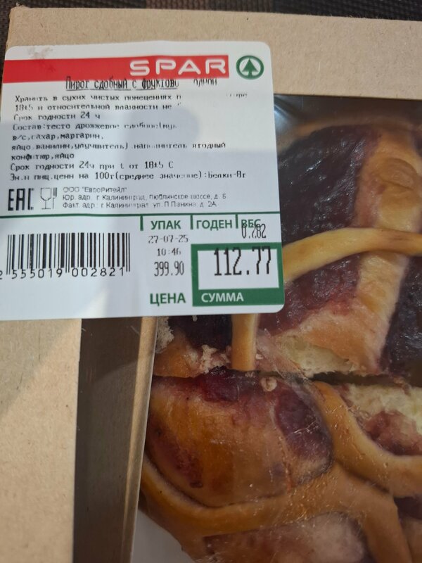 Второй раз покупаем, второй раз сырой. Пирог сдобный с фруктовой начинкой.