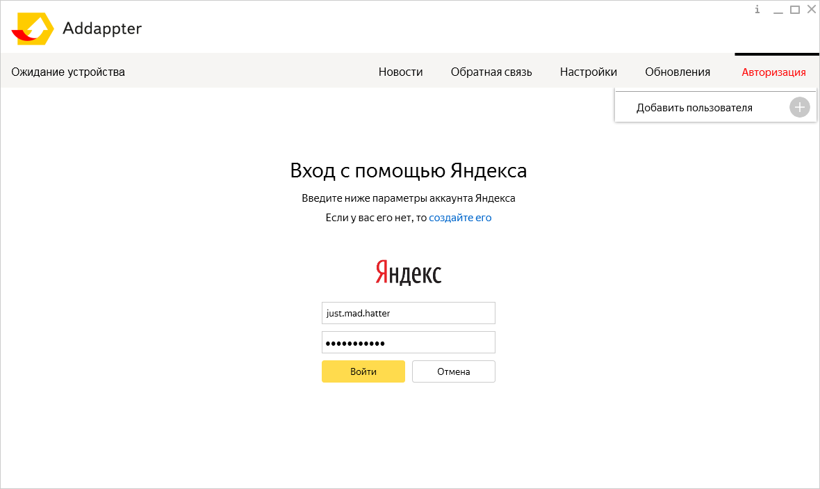 Для доступа ко всем персональным сервисам Яндекса (Музыка, Диск, Почта и т. п.) используется общий аккаунт. Если вы зарегистрированы на любом из этих сервисов, используйте этот же аккаунт и для авторизации в Addappter.
