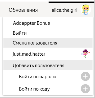 Если вы не хотите, чтобы другие пользователи переключались на ваш аккаунт, выйдите из него после завершения работы с Addappter. Для этого в правом верхнем углу программы нажмите на свой аккаунт и выберите пункт Выйти.