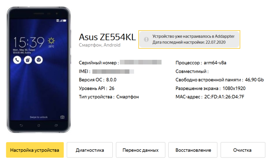 Если телефон уже настраивался, при подключении на странице с информацией об устройстве вы увидите соответствующее предупреждение и дату предыдущей настройки.