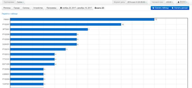 По умолчанию отображается общее количество настроек в вашей сети за последний месяц, а также количество настроек по каждому салону.