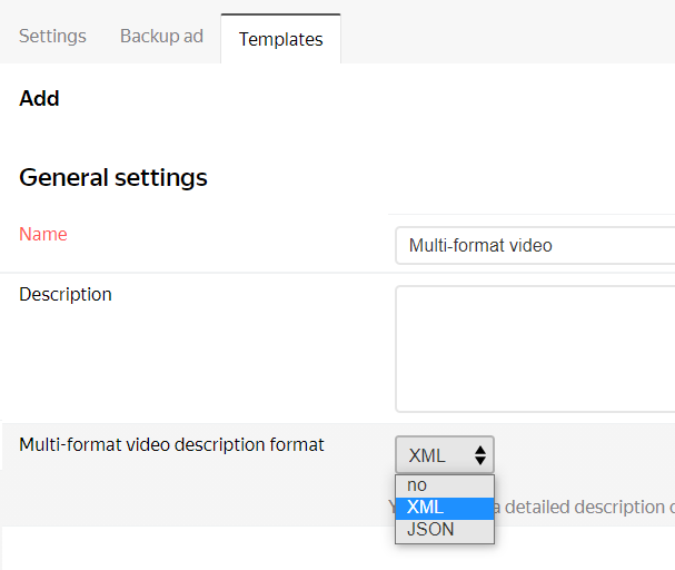If necessary, you can add your own format descriptions in XML or JSON form, depending on the format selected for describing a multi-format video, in the MediaFiles tag.