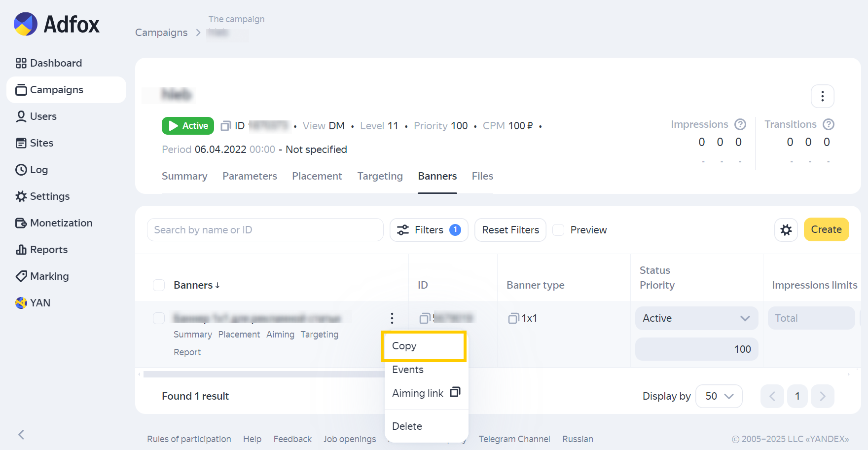 Data transfer to the Russian state register (ERIR) is disabled for the newly created copy. To start transfering this data, select Marking procedure → Submit data to state register in the parameters of the newly created banner after copying is complete.