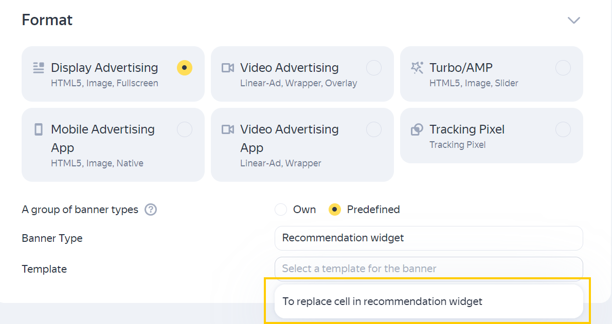 If you don't specify a position in the banner parameters, it attempts to replace the ad cell of the recommendation widget. When the total CPM of campaigns with such banners is higher than the CPM of the Yandex Advertising Network recommendation widget, your banners replace all ad cells in the widget.