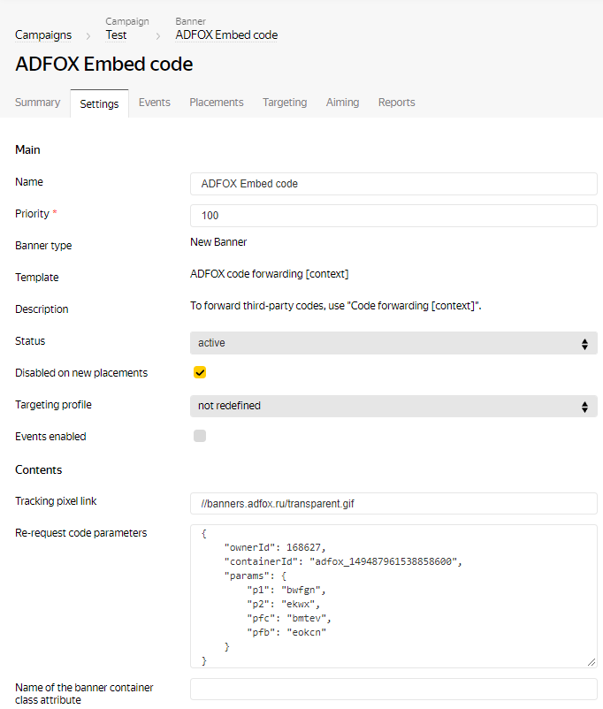 Re-request code parameters: Insert the ADFOX ad tag parameters.
