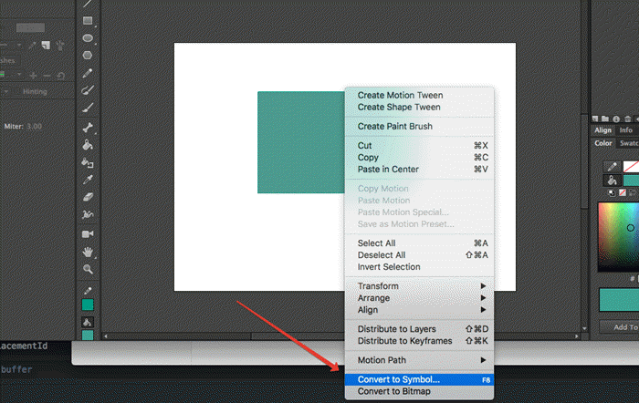 Create an object on the scene, for example, using Rectangle Tool. Then select the object and select Convert to Symbol... in the context menu.