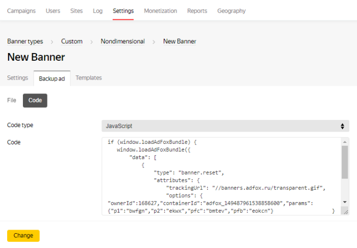 - To add a backup ad with any HTML code, use the code generator.