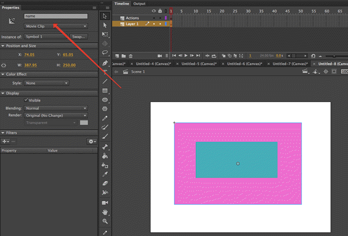 Let's say that the button is inside another symbol, for example, Movie Clip. In this example, this Movie Clip has the Instance Name “name”.