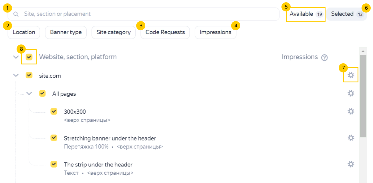 3. Switch to the list of selected placements: it will contain only sections and placements inside the selected site.