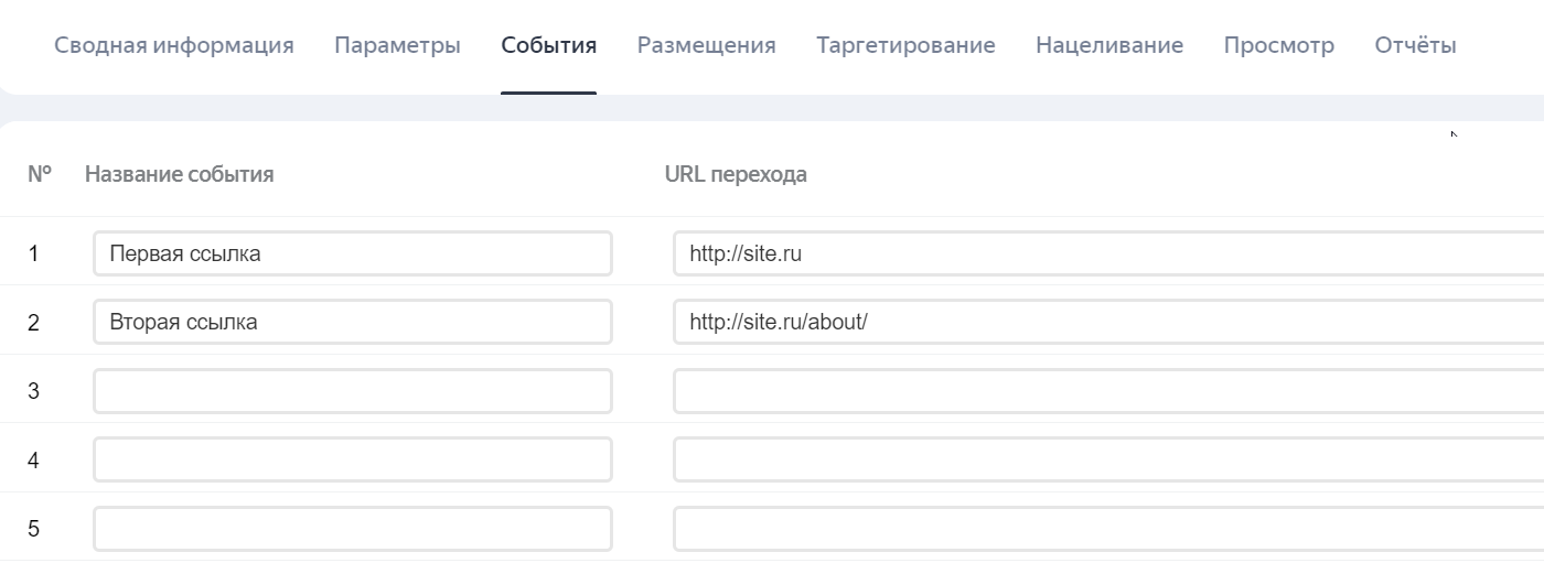 3. После сохранения в параметрах баннера перейдите на вкладку События и задайте соответствие ссылок и событий:
