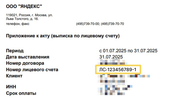 Чтобы платеж был корректно зачислен, в назначении укажите номер лицевого счета (ЛС-XXXXX). Иначе средства попадут в ручную обработку, что может привести к задержке пополнения и временной блокировке прямых кампаний в Adfox.