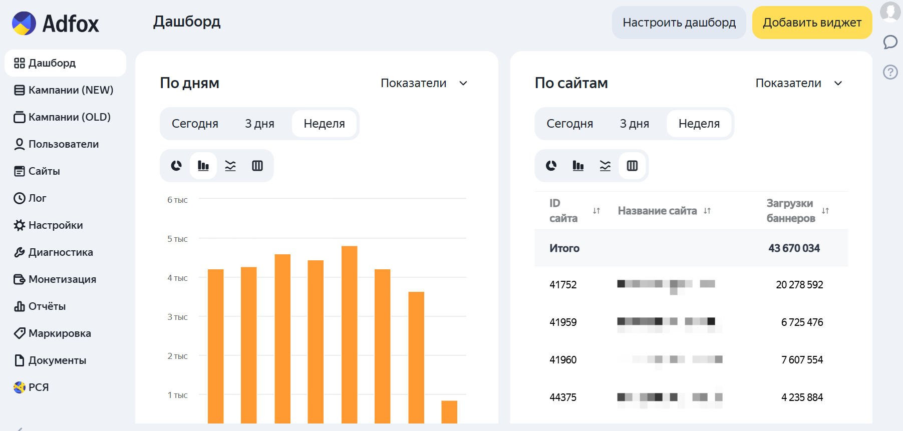 - В интерфейсе Adfox перейдите на вкладку Дашборд и нажмите кнопку Добавить виджет.