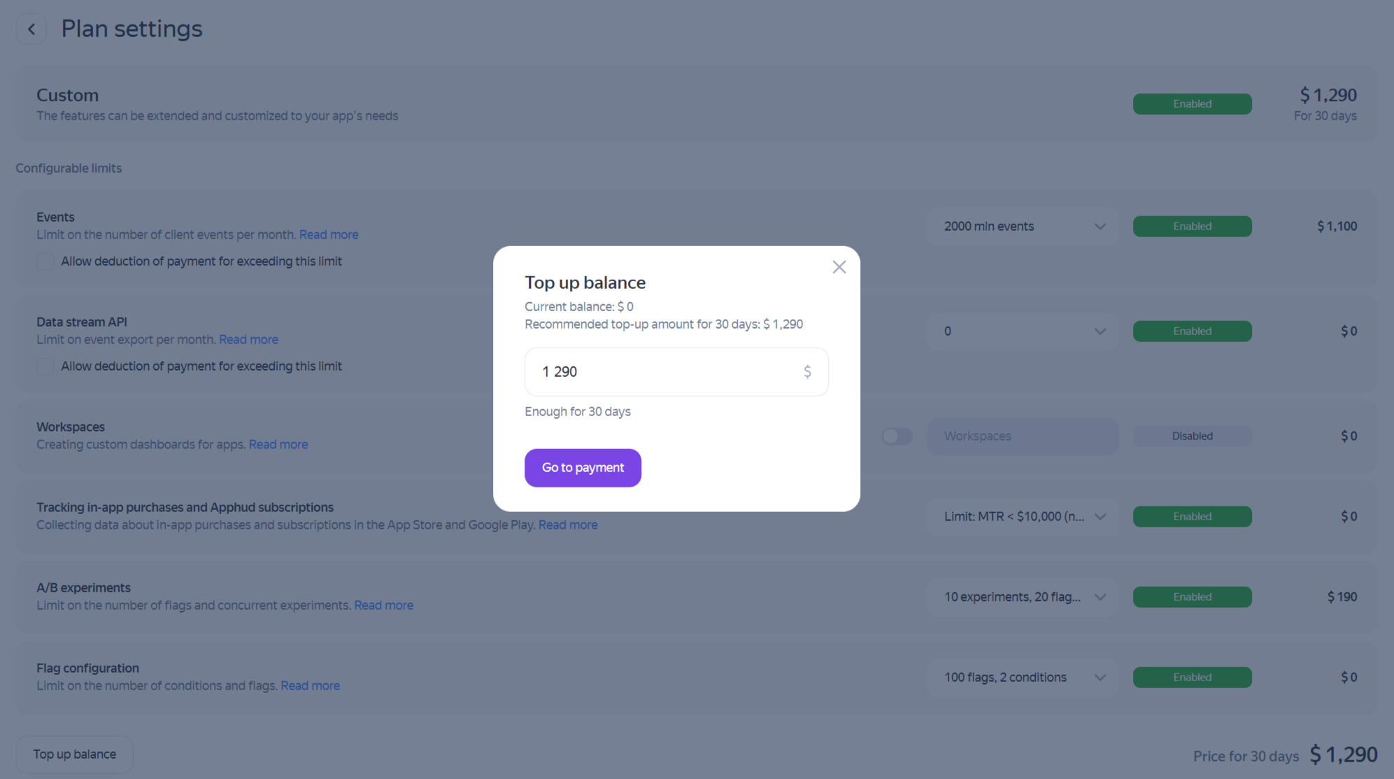 AppMetrica paid services are provided on a prepaid basis. You need to keep your account balance positive at all times. You are charged every day for the services provided on that day.
