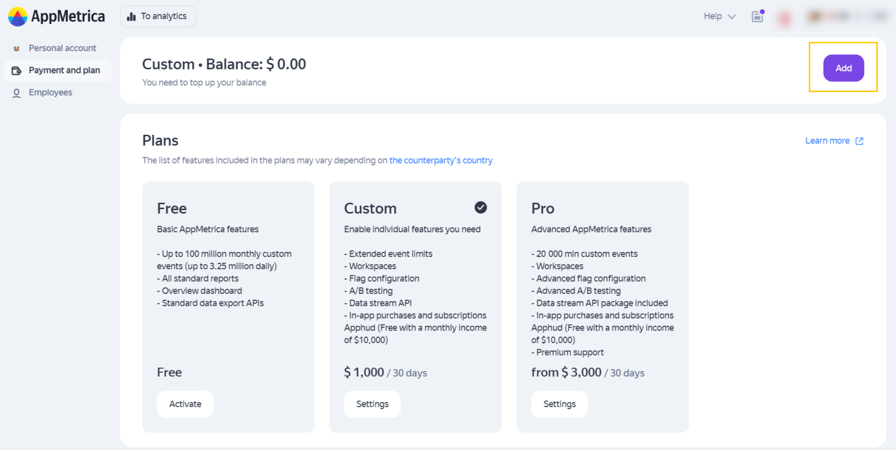 When registering an AppMetrica account, you automatically get the Free plan. If you want to use paid tools, switch to the Custom or Pro plan.