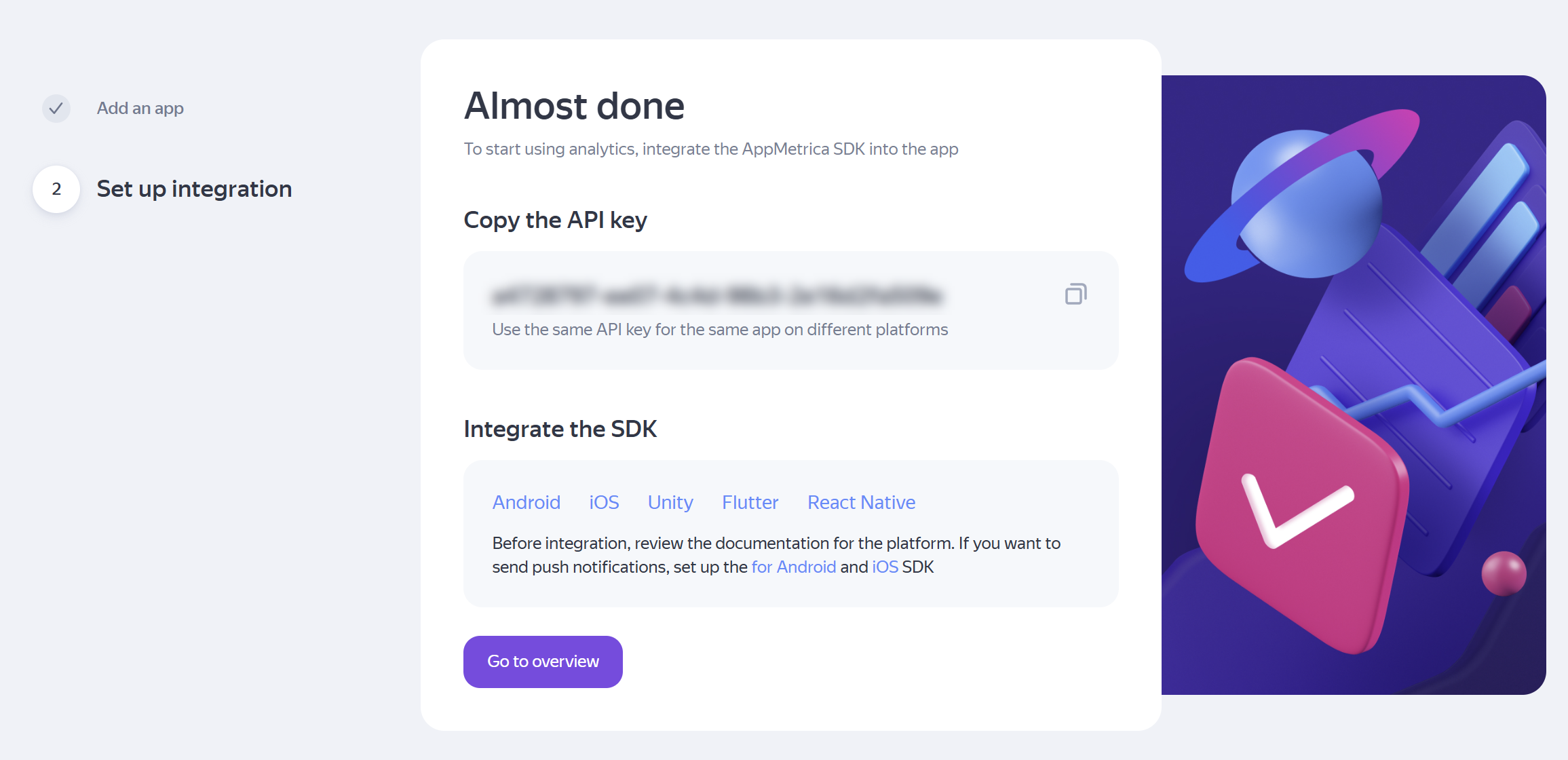 Set up integration: copy the API key to integrate the SDK into your app. If you have forgotten to copy the API key, you can always find it in your personal account under Settings → Main.