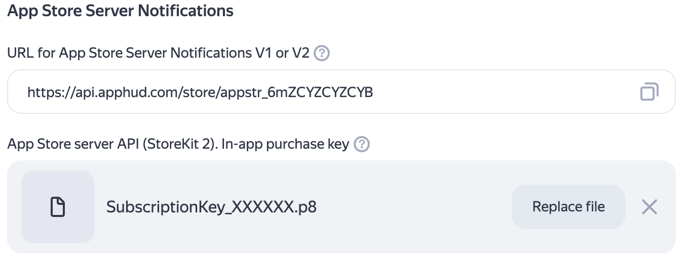 Once you upload the In-App Purchase Key, a string will appear in the interface. This is a URL for configuring App Store Server Notifications.
