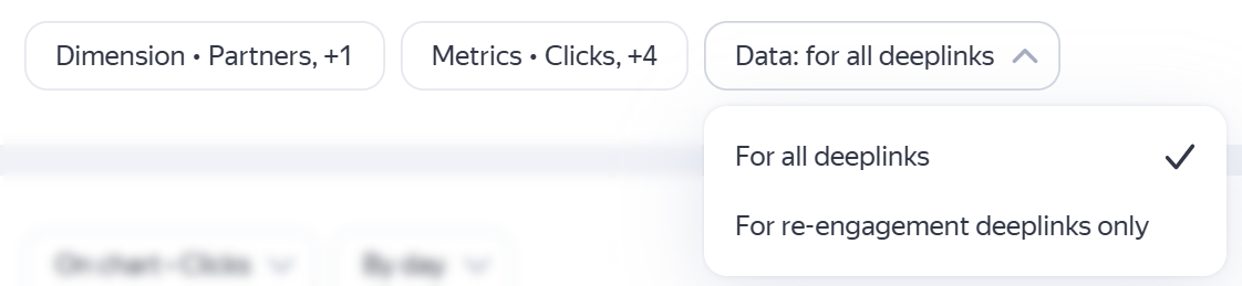 The choice affects the calculation of metrics from the Main metrics block. All other metrics are calculated only for re-engagement deeplinks.