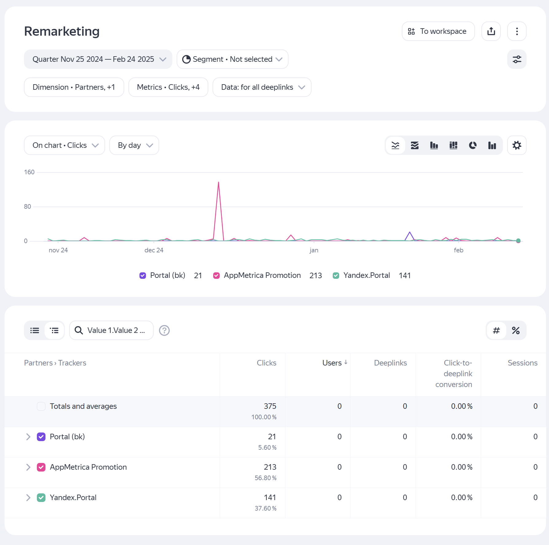 - Clicks. The number of clicks that users made on the tracking link or re-engagement deeplink.