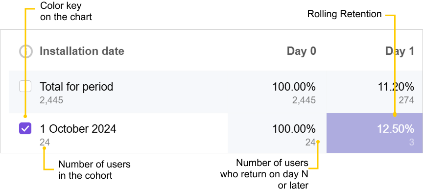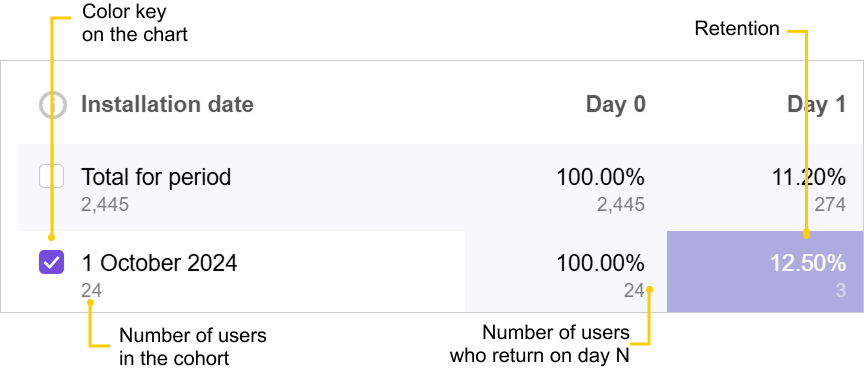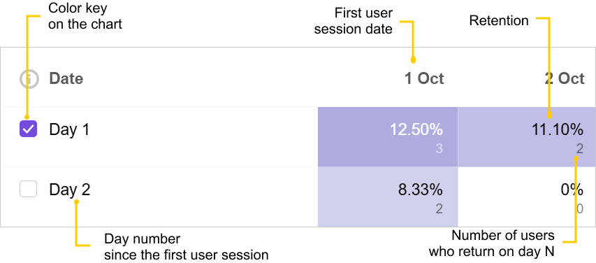 • On the next day after the installation (Day 1, which is outlined with a dotted line), 1 user from the first group and none from the second group returned to the app. The Retention metric is 50% for the first group, and 0% for the second. The installation dates are different, and you can track changes in the Retention metric for the specified period after the installation.