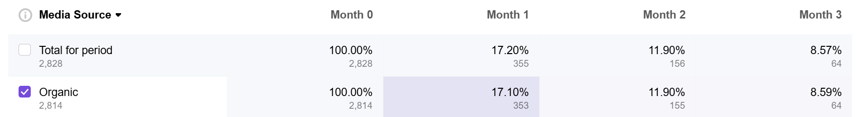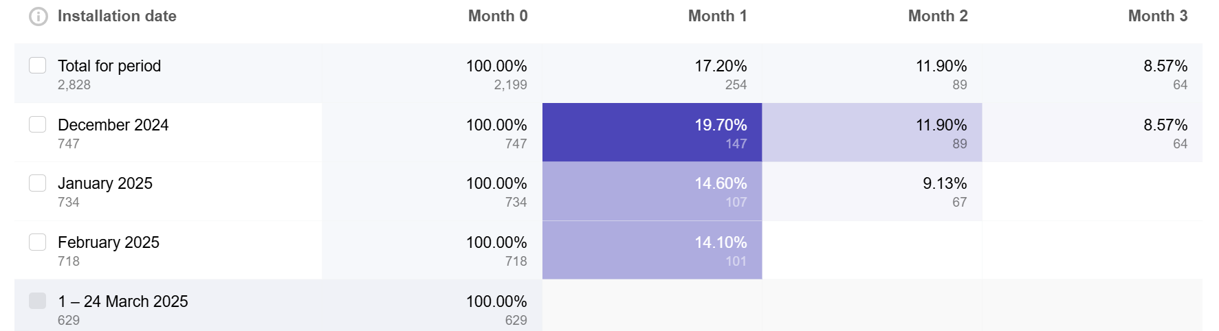 The percentage of users who installed the app during a given day, week, or month (the reference period) and then returned to the app (opened it) on a specific day, week, or month after installing. Is calculated as the ratio of the number of users running the app during the Nth day, week, or month to the number of users who installed the app in the reference period (this number is taken as 100%).
