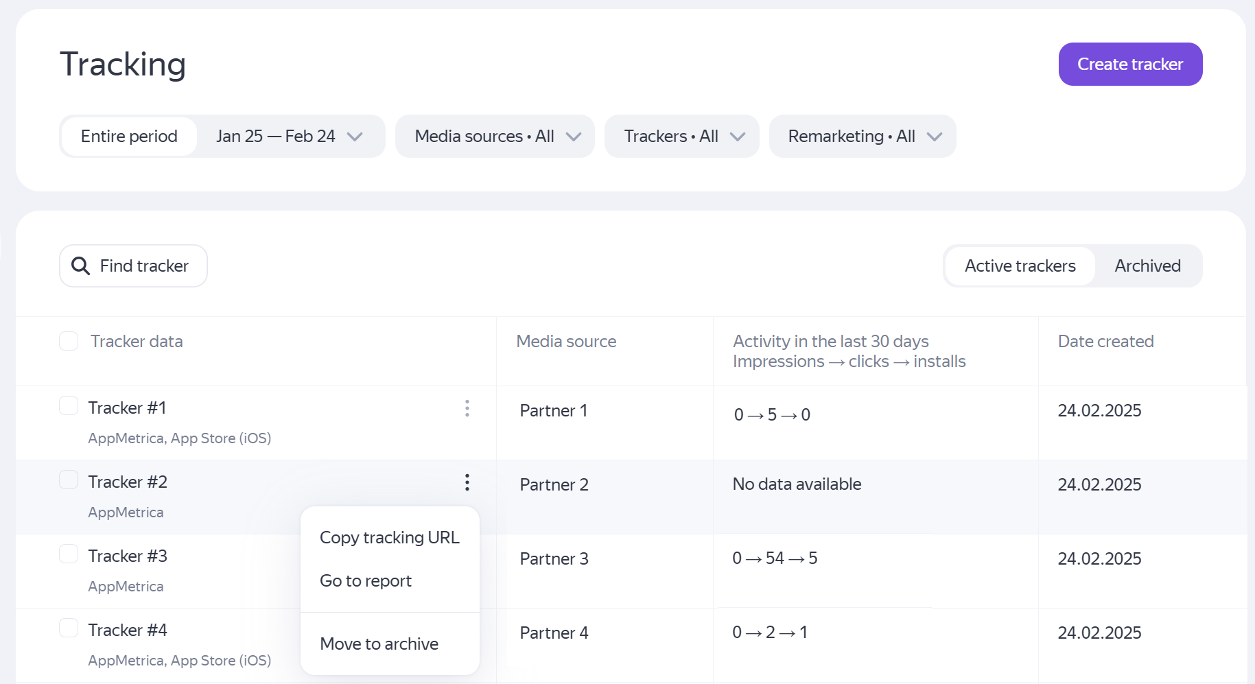 You can view the trackers configured in AppMetrica under Tracking → Tracker list.
