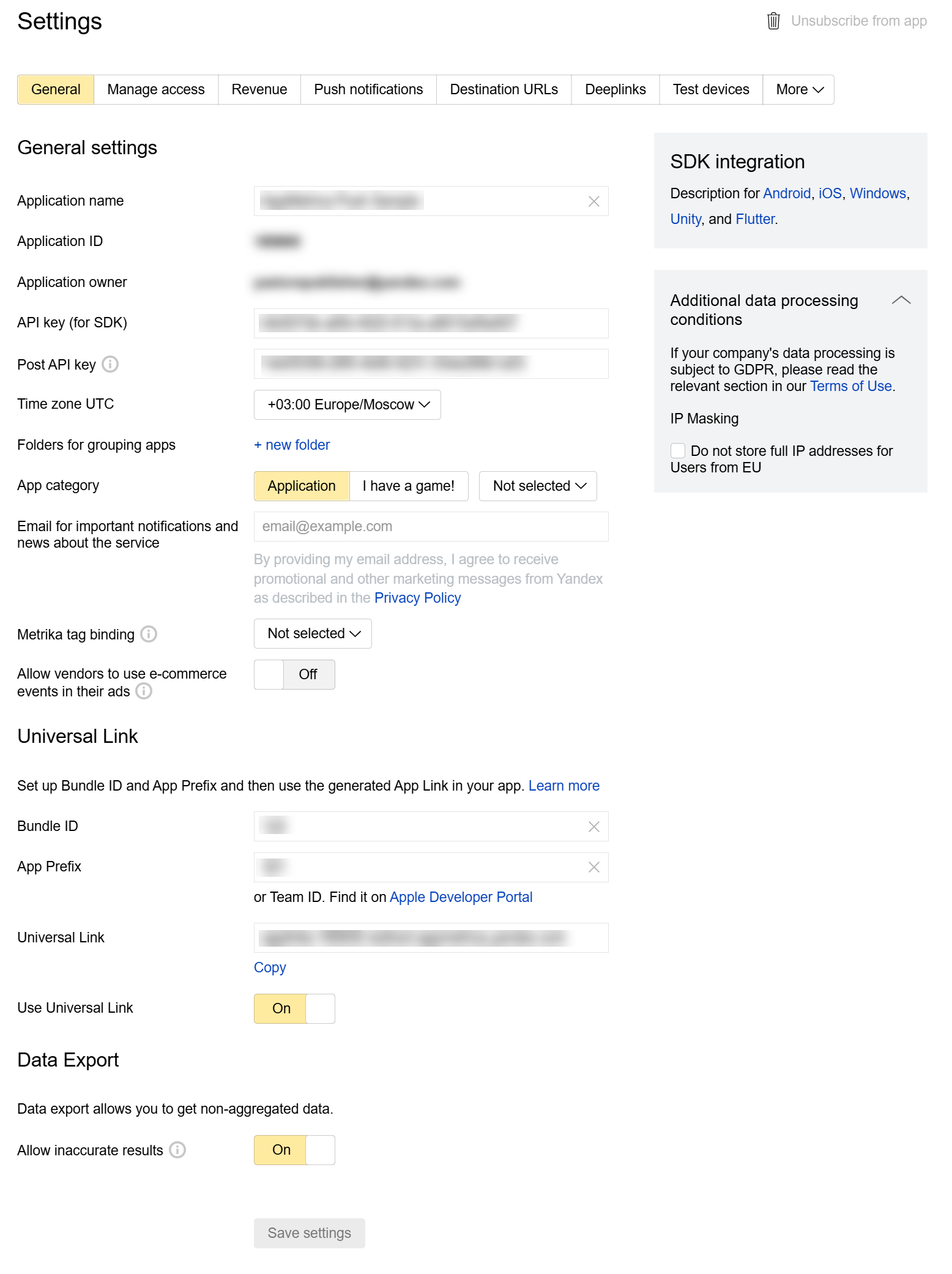 The Universal Link field shows a link in applinks:<app_id>.redirect.appmetrica.yandex.com format, where <app_id> is your app's ID in AppMetrica.