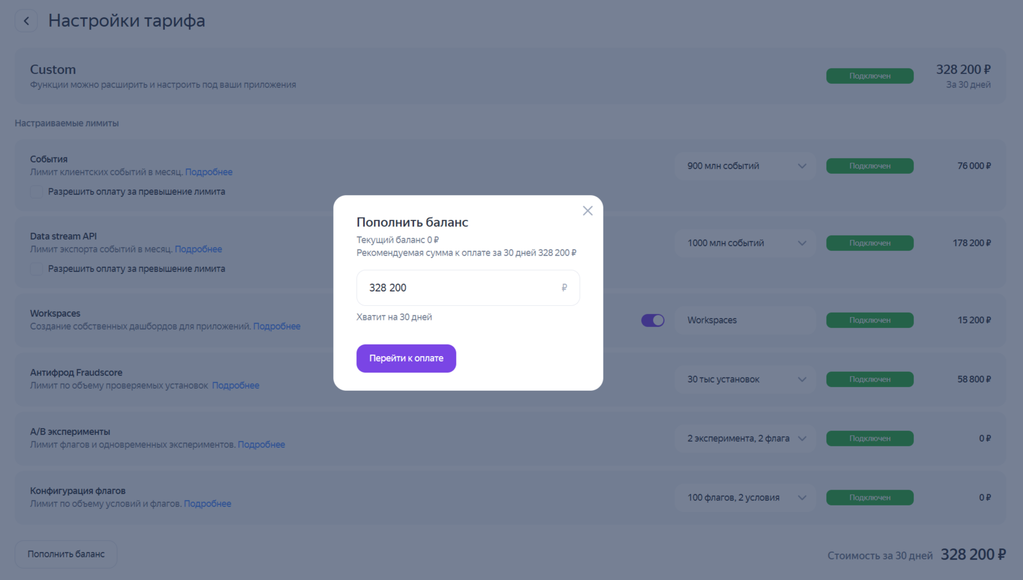 После подключения платного тарифа система предложит пополнить баланс на сумму, которой хватит на месяц. При необходимости сумму можно изменить.