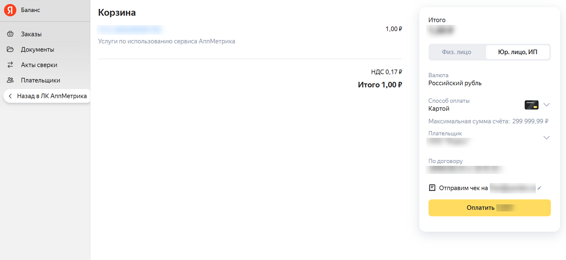 Откроется кабинет Яндекс Баланса. Выберите способ оплаты — Картой или По счету.