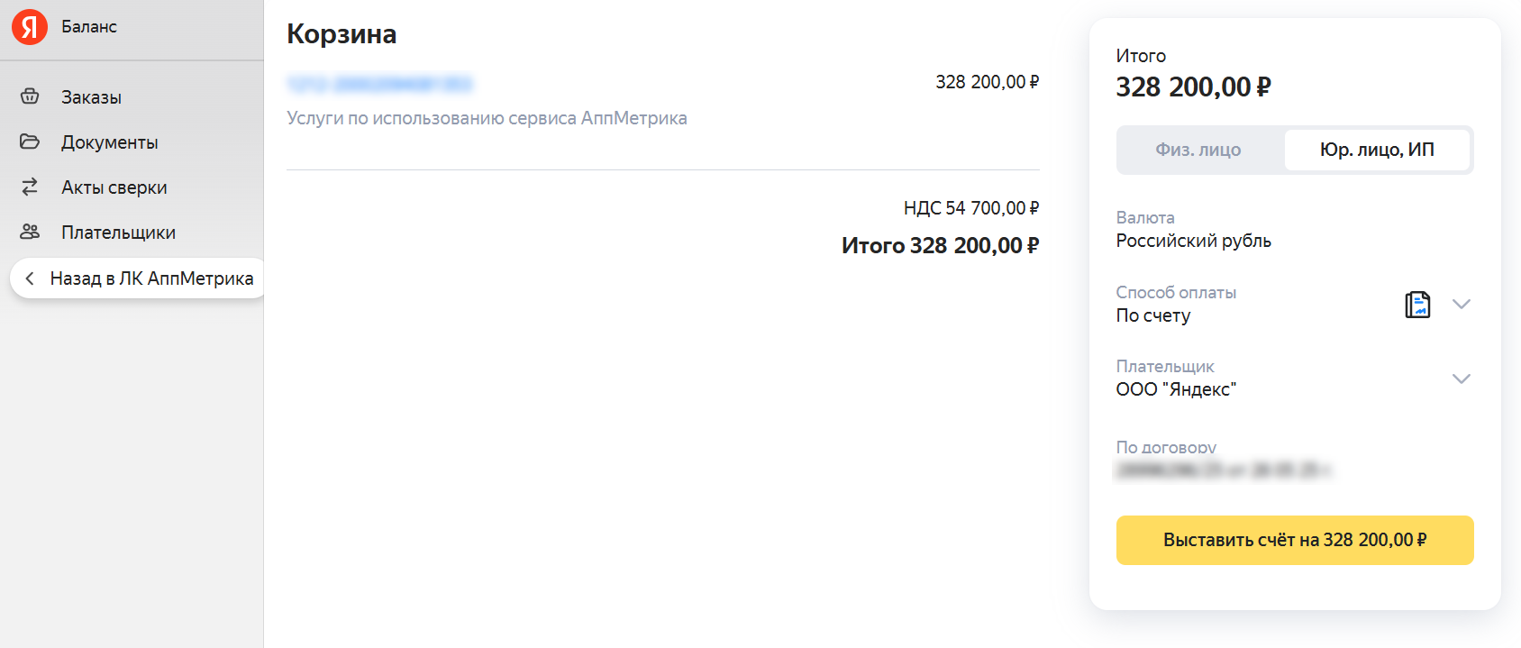 Откроется кабинет Яндекс Баланса. Сформируйте и оплатите счет.
