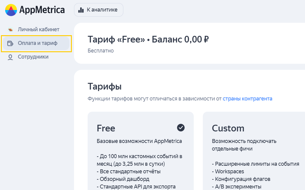 При регистрации кабинета AppMetrica автоматически подключается тариф Free. Если вы хотите использовать платные инструменты, подключите тариф Custom или Pro.