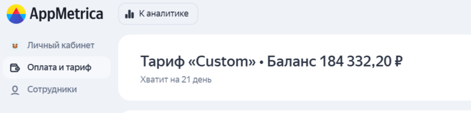 Платные услуги AppMetrica предоставляются на условиях предоплаты. Необходимо поддерживать положительный баланс кабинета. Каждый день со счета списывается стоимость услуг, оказанных в течение этого дня.