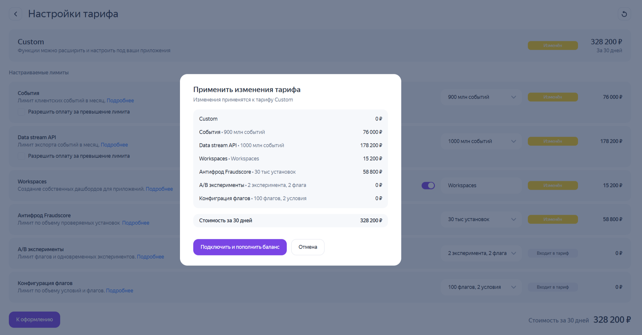 Откроется страница с настройкой тарифа в виде калькулятора. Выберите нужные инструменты, если нужно — увеличьте лимиты. При каждом изменении будет меняться статус строки, а внизу будет отображаться общая стоимость подключаемых услуг.